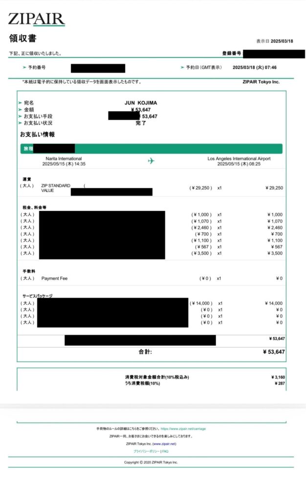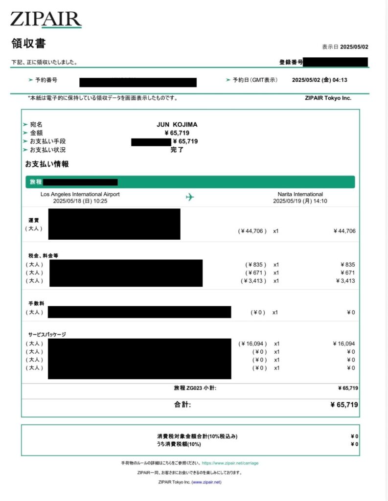 2025年5月2日「ロサンゼルス国際空港⇒成田空港間の航空機のチケット購入(ZIP AIR)」