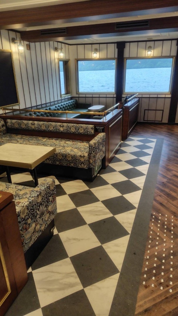 窓から芦ノ湖が見える絶景の位置に座るのがポイント。私は座れませんでした。